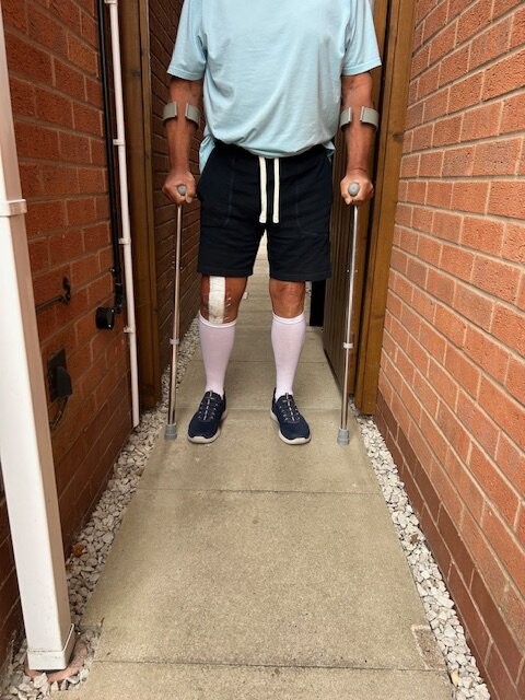 Bruising has almost gone along with most of the swelling. Just the knee joint itself is still swollen and stiff. Can’t bend it to 90 dregs but not far off. Walking ok, outside with crutches , inside walking ok without. Sleeping has been hit and miss but had a better night last night.