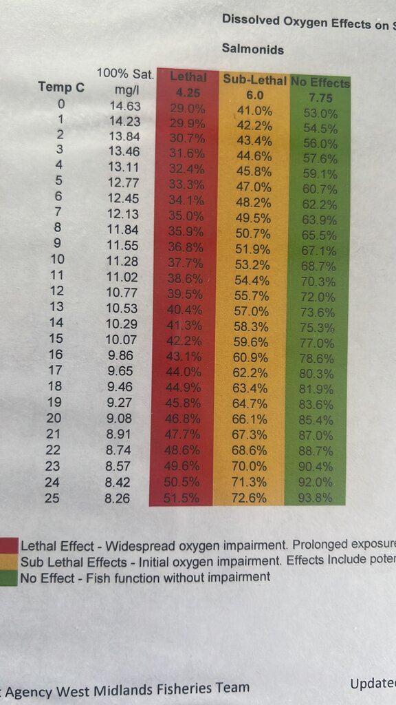 I think a few are getting confused with the consequences of the lowered oxygen saturation point with increasing temperatures. We are not going to see water temps get to a level where at saturation point there isn’t enough oxygen for coarse fish. The important reading is the dissolved oxygen concentration in mg/l (as per Sids earlier post, my local club also use a Polaris). Approx. 6.5 mg/l means normal function for coarse fish, 4.7 mg/l is sub lethal and around 3 mg/l would be lethal. Salmonids will suffer first.
