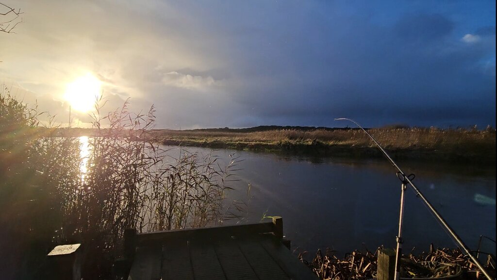 Half way down the track I put up a bittern. Only the second time I have seen one. Reaching my swim it was magnificent. A dramatic sky with dark black rain clouds and yet the sun shone throughout the day. Being winter and with a low sun, the light was absolutely sublime as it highlighted the pale reeds opposite me.